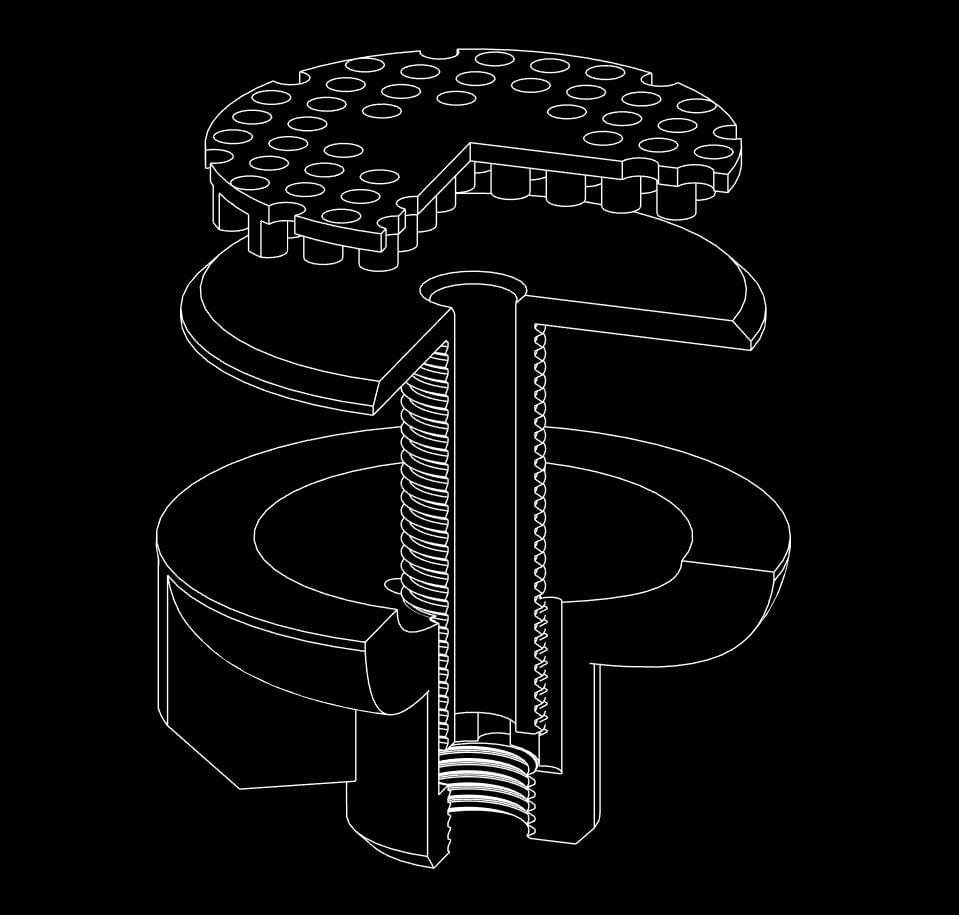 We use a bottom convex element to capture water flowing around the screw, though we expect the bulk of water to flow through it.